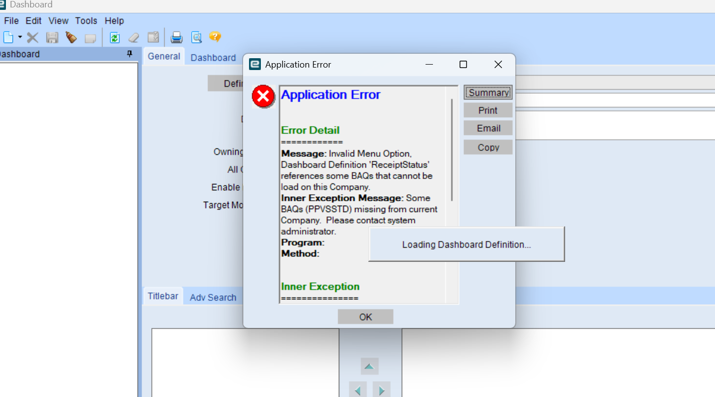 I had a dashboard with several BAQs. One of the BAQ tabs became unnecessary, so I ended up deleting that BAQ first. I should have deleted that tab from the dashboard first, but I completely forgot. So, when I tried to open the dashboard right now, the following pop-up appeared and it wouldn’t open. I tried to recover the BAQ, but it has already been deleted and cannot be recovered.