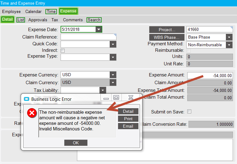 Description: The non-reimbursable expense amount will cause a negative net expense amount of -54000.00.