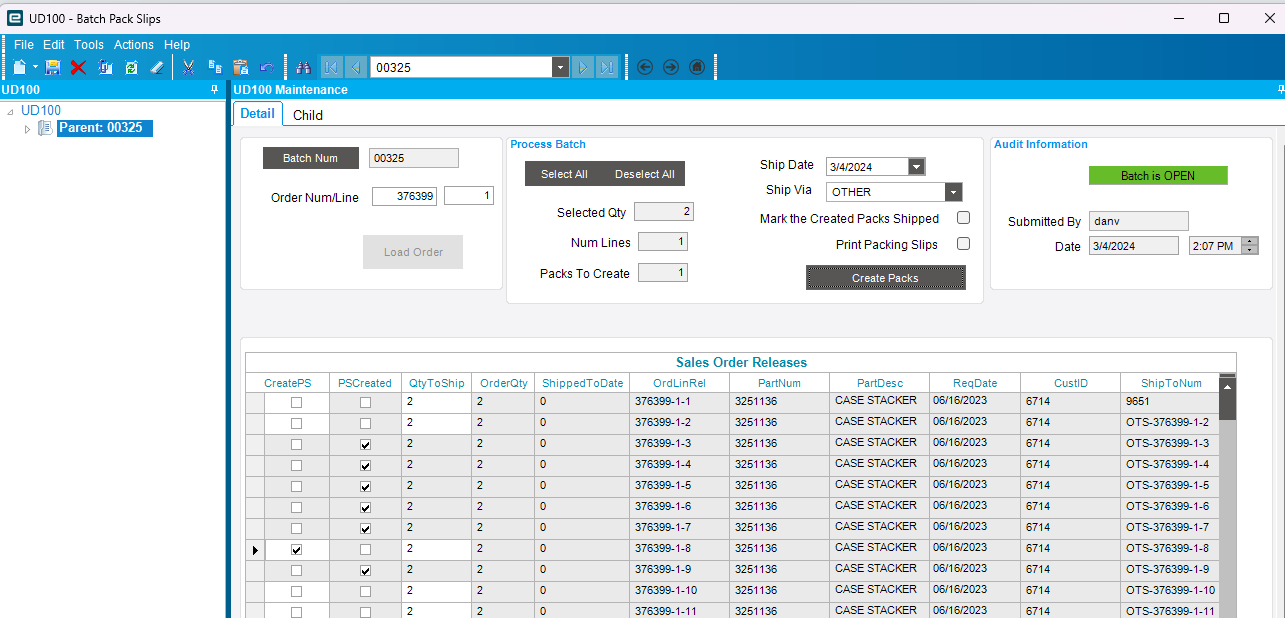 When the Create Packs button is pushed, it will cause the UD100 pre-processing BPM to fire. The BPM was responsible for writing the pack and shipment line information for an XML file for each pack. Service Connect would then pick up each XML file and create a Pack from the data in the XML file.