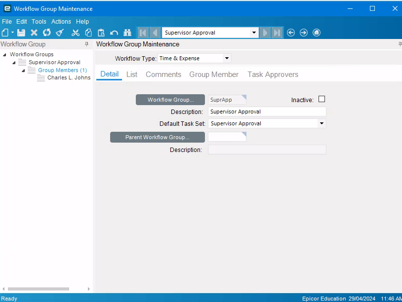 You will see that Charles L. Johnson is setup as an approver and there is a Time and Expense Workflow group to be configured.