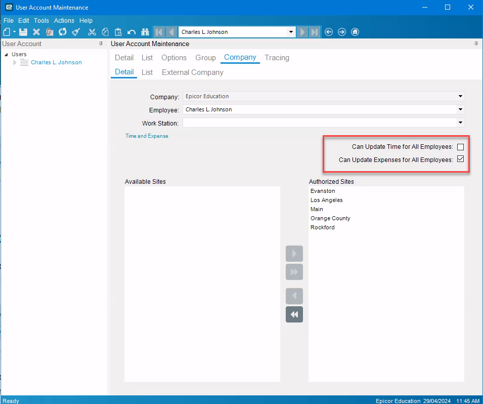 There is one additional setting on the Company tab in User Account Security Maintenance to allow a user to be able to update time and expense records on behalf of other users.