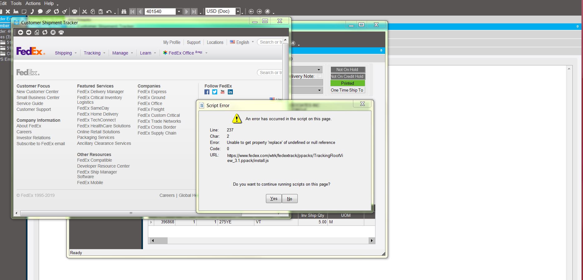 I have one Order Entry user that has an issue. When she opens Cust Sipment Tracker and hits the Tracking Details button, it doesn’t work, but only fir the fed ex tracking. The screen that comes up and she gets the below. She is the only one this happens too. Ideas?