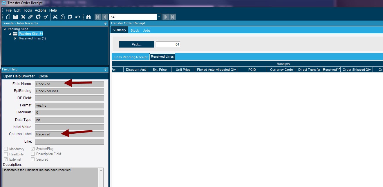 How does Epicor store a Transfer Order as received? There is no field I can see, it’s just some status. How is this calculated or where is this stored?