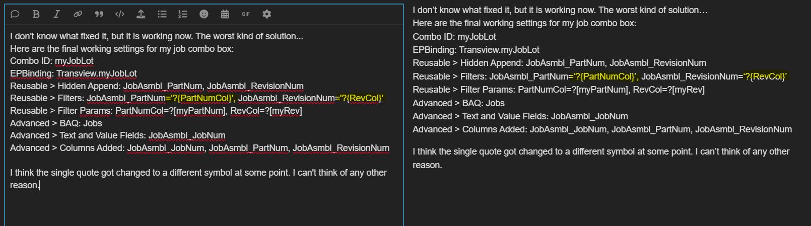 I noticed during my testing that if my BAQ feeding my combo box returns a lot of data (6.7MB, my whole job list), then the entire browser locks up until I close and restart it. I am trying to get my filter working but each fail I have to close and reopen everything. Is there a better way to test my filters on my combo box?