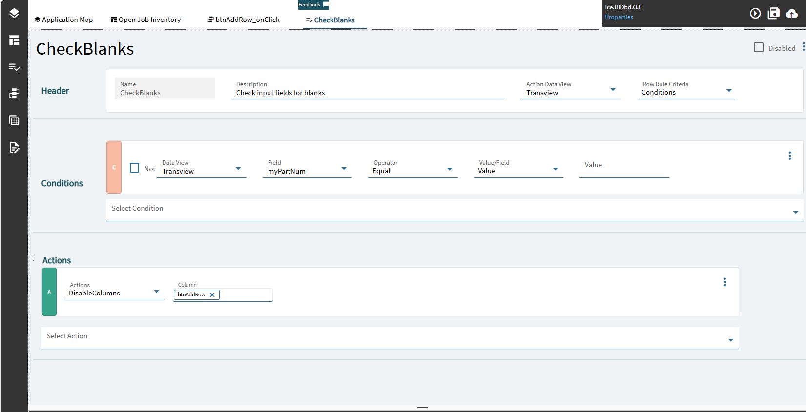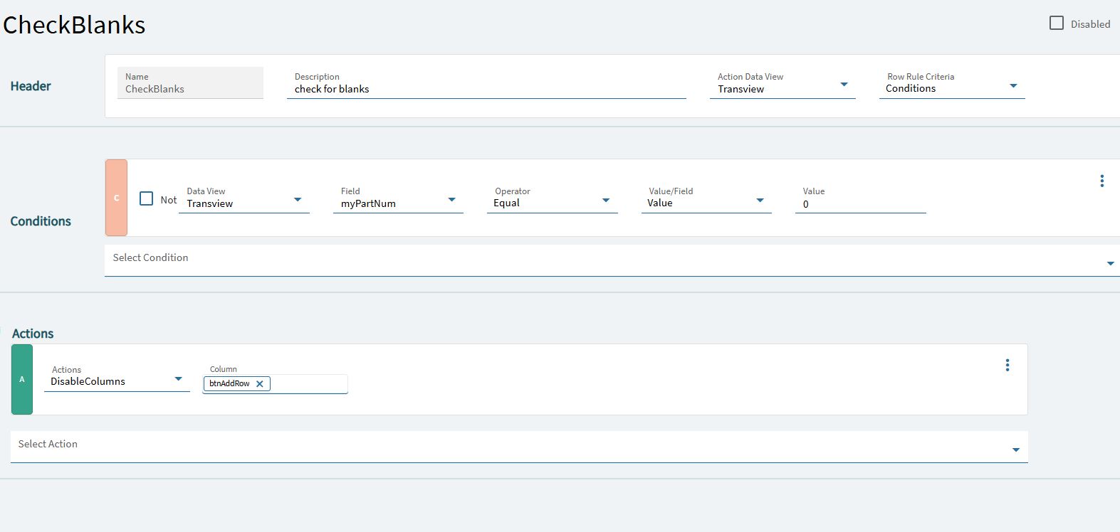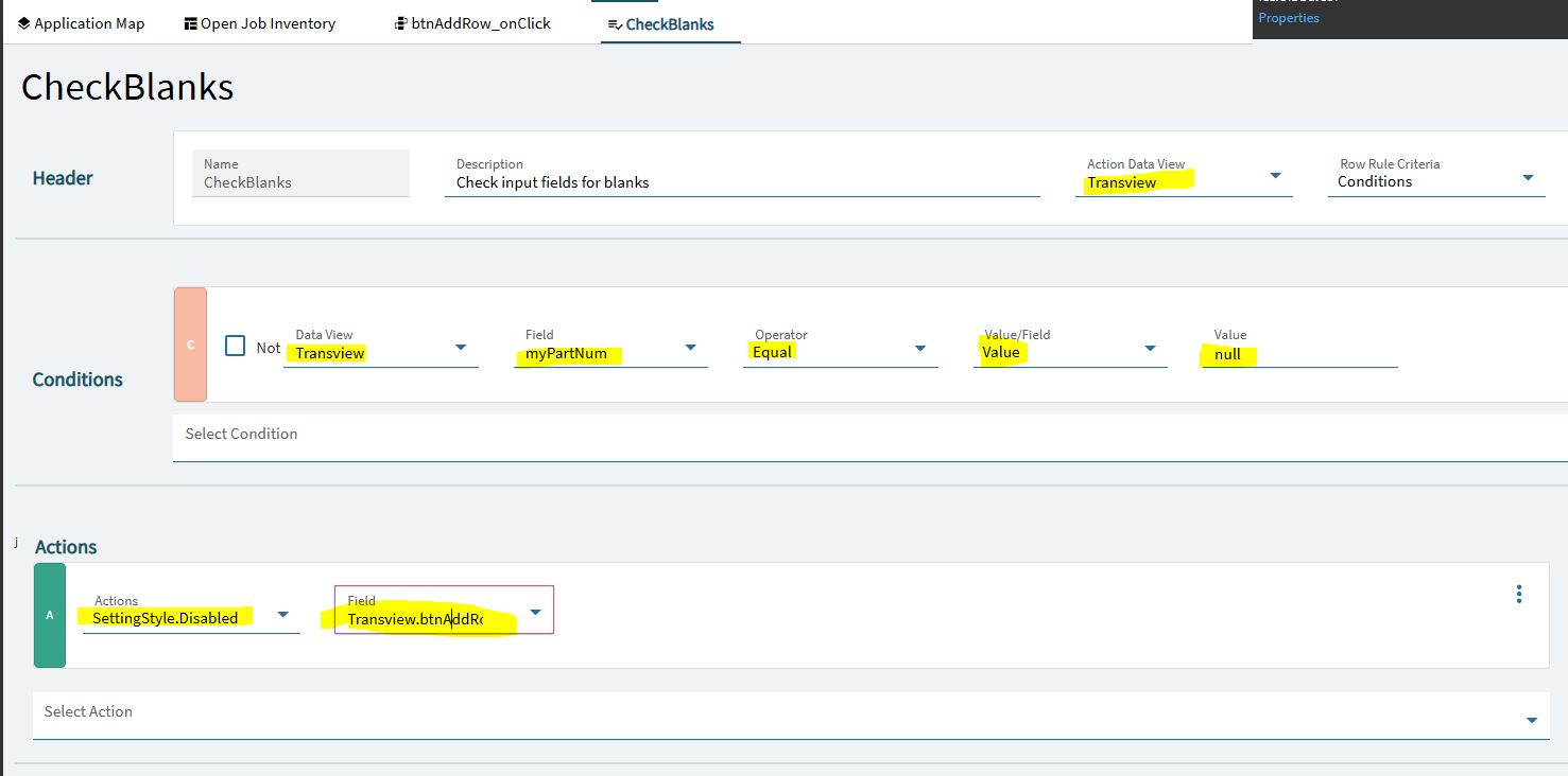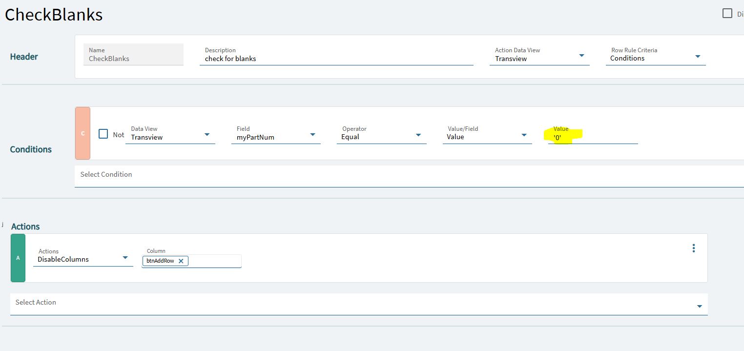 I am working through the data rule, but I don’t know how to set the button to disabled. I named the button btnAddRow, the epbinding is Transview.btnAddRow. This is my checkblanks data rule just looking at part number for now to test. I will add the other fields once I get this part. I also tried the “Disable” action but it wants a column or a row. My button is neither a column or a row, right? I have tried various values for checking for blanks, from an empty field to the word null and empty quotes.