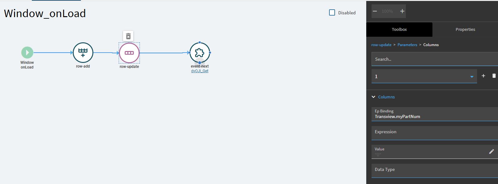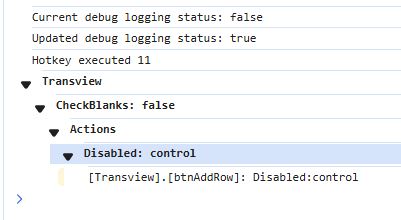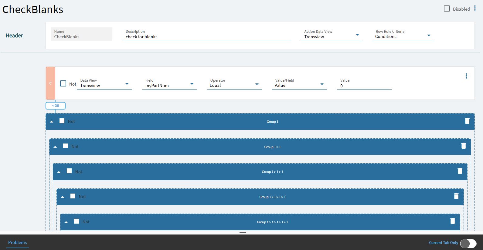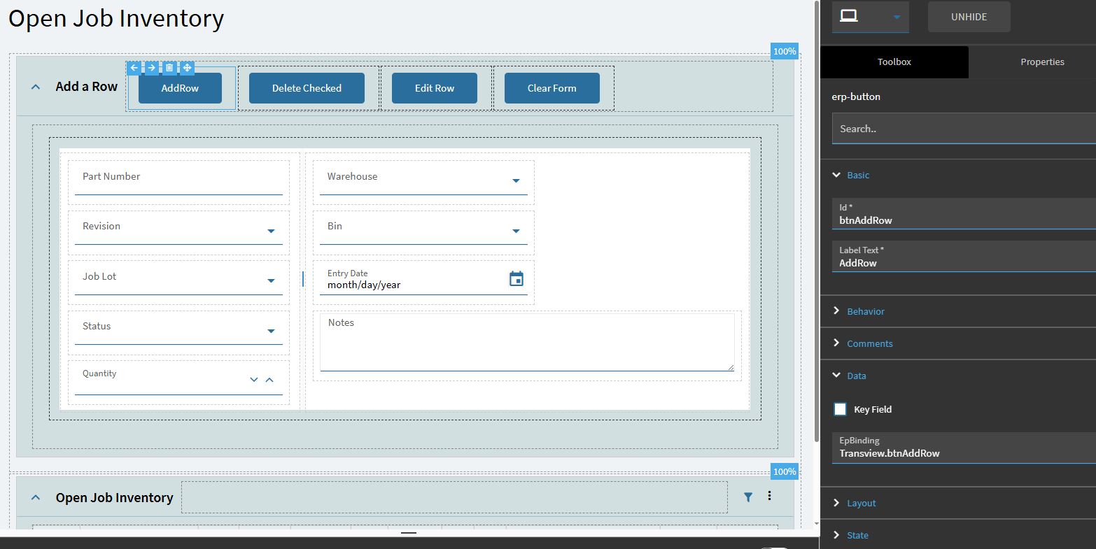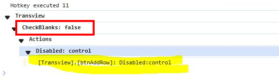 I am working through the data rule, but I don’t know how to set the button to disabled. I named the button btnAddRow, the epbinding is Transview.btnAddRow. This is my checkblanks data rule just looking at part number for now to test. I will add the other fields once I get this part. I also tried the “Disable” action but it wants a column or a row. My button is neither a column or a row, right? I have tried various values for checking for blanks, from an empty field to the word null and empty quotes.