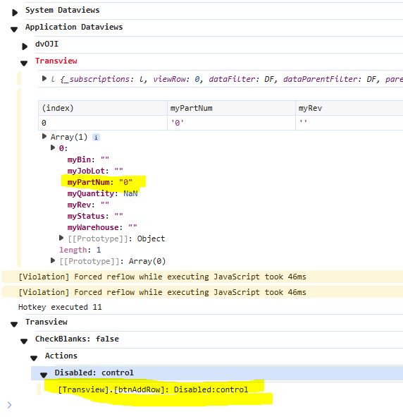 If I understand the data rules you gave me, this should disable the AddRow button if the part number field is blank. The disabled status of the button never changes, regardless of the value in the part number field. Did I miss something?