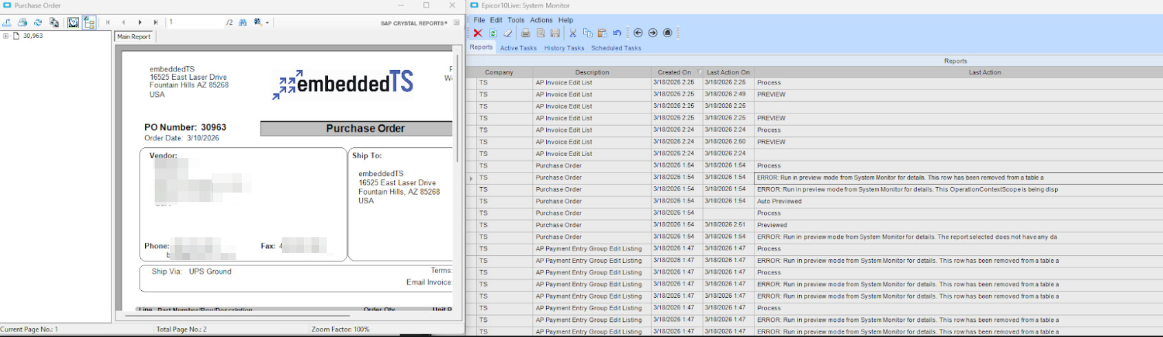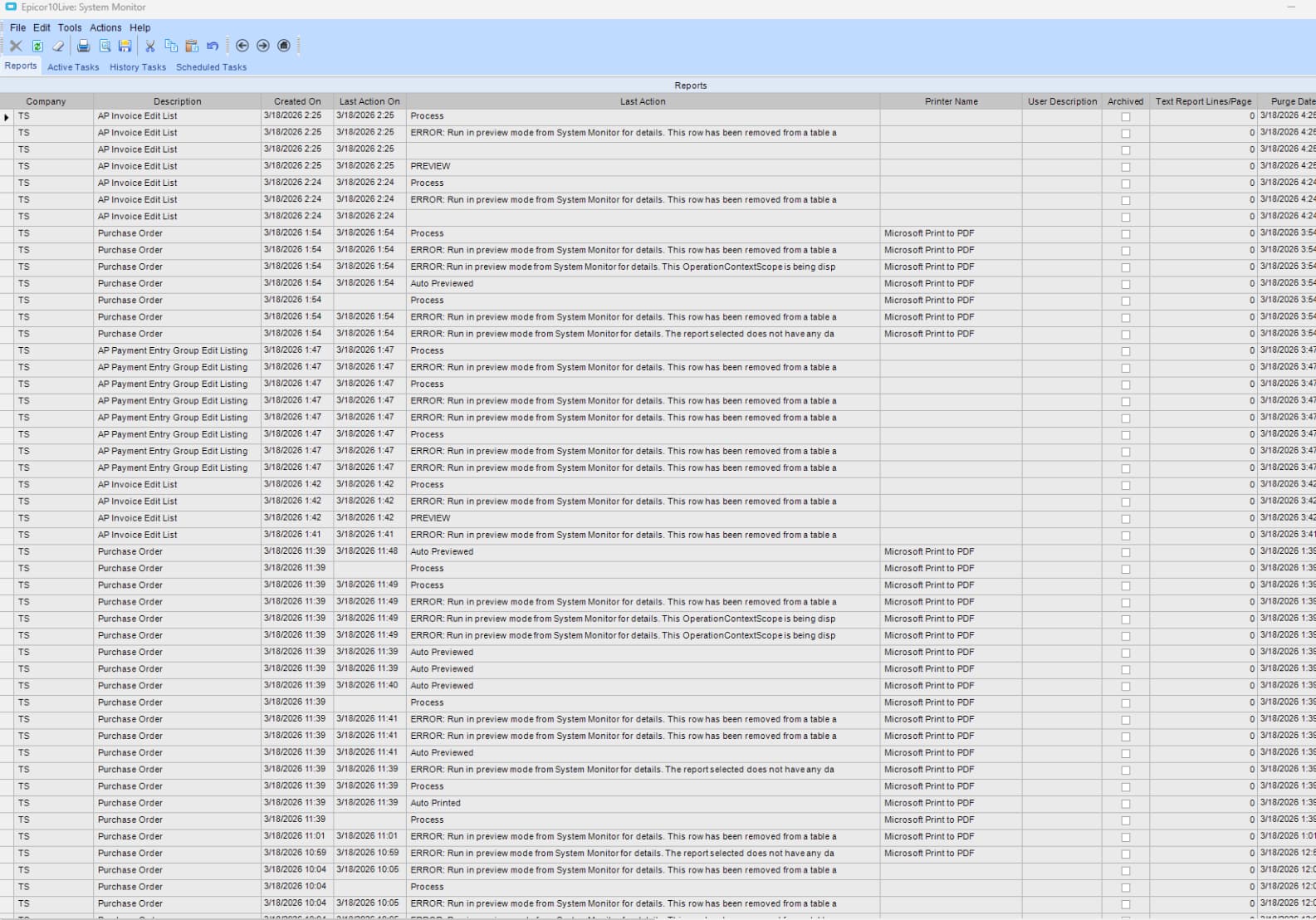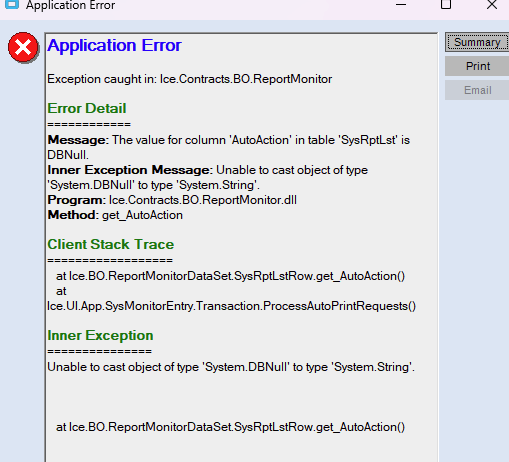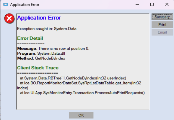 If she highlights a row that says ERROR: Run in preview mode from System Monitor for details… She sees the report she was trying to print with no errors.