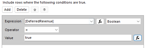 I have then edited the Dataset in the SSRS and added a join for the two tables, declared the DeferredRevenue field and then added a Bollean filter for Deferred Revenue = True.