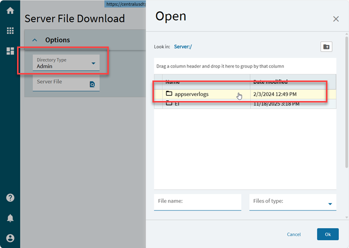 We’re on cloud - select Admin from the dropdown, then look for the appserverlogs folder. Can take a few seconds for the folder to appear but then you should be able to search/download the appropriate file.