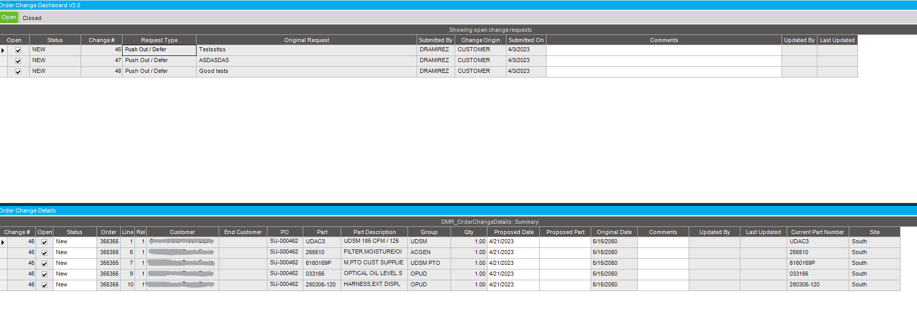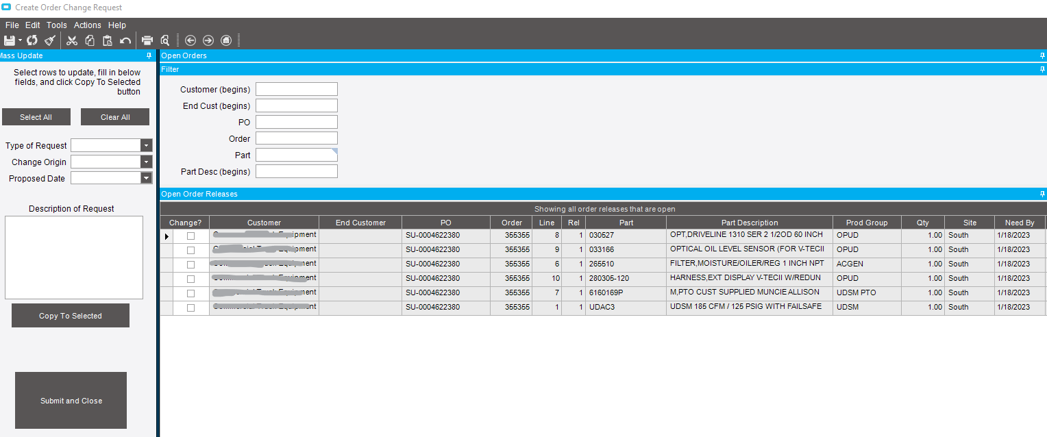 So the idea of this dashboard is supposed to grab all releases on an order to allow a user to select which ones they want to put in a change request for. You select the first column either by clicking each line or by pressing the Select All button. If you have a mass update, you can put the details in on the left and click Copy To Selected. It fills in all the rows with a check box in them with those details. Or you can manually fill in each line if they are different.