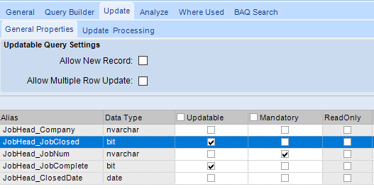 Hi! I’m trying to create an UBAQ to Complete and Close Jobs. We use the AutoComplete/Close process which Complete/Closes the majority of them. There are always a bunch that need to be reviewed outside the predetermined thresholds. My goal is to mass Complete/Close these Jobs that are left after doing a Qty/Financial review. Doing a DMT is not convenient, it seems that giving the users the ability to Complete/Close them on a Dashboard screen is faster.