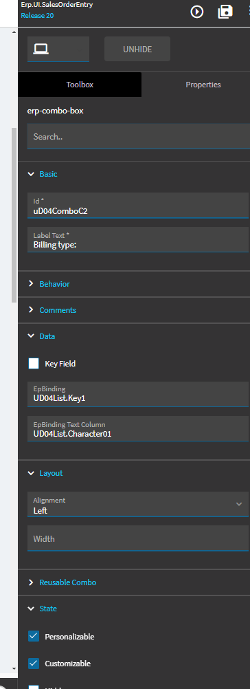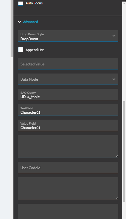 So for your combobox… get rid of any BAQ related settings you had in there before. We’re no longer trying to get data from the BAQ itself, we’re getting our data from what was brought into the BAQ dataview.