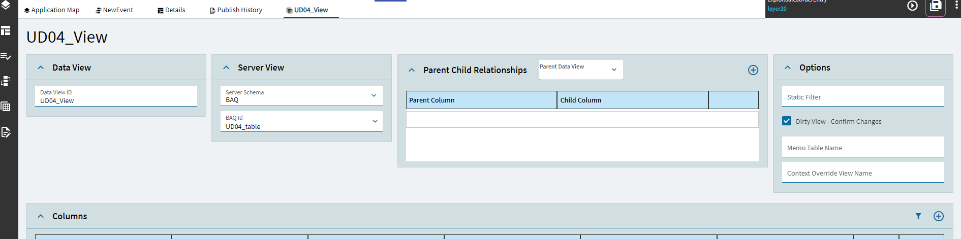 There COULD be a conflict that you used “UD04” which is a native table name within Epicor.
