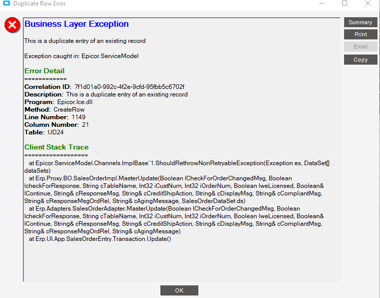 Ordernum isn’t a duplicate field for OrderHed. That is where I am stuck. Also, I have changed the ponum to completely different things and even the shiptonnum is different. So, there are at lest three of the 5 that are different and get the same error. Here is my BPM, I am sure something is off, I just can’t find where. Note: I also went through and set the 5 keys to orderhed variables like Ordernum, Custnum, etc.
