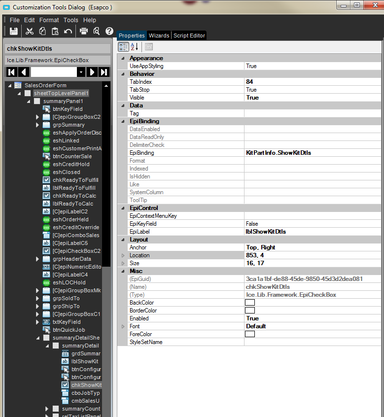 One of our users noticed that the Sales Order Entry Summary > Lines Detail grid tab on the bottom covers up the Kit Details checkbox and the Configuration button in our 10.2.200.10 testing environment. It should be to the right of the “Order Lines” text on the Lines Detail grid. It’s fine in our 10.2 Epicor EDU test environment.