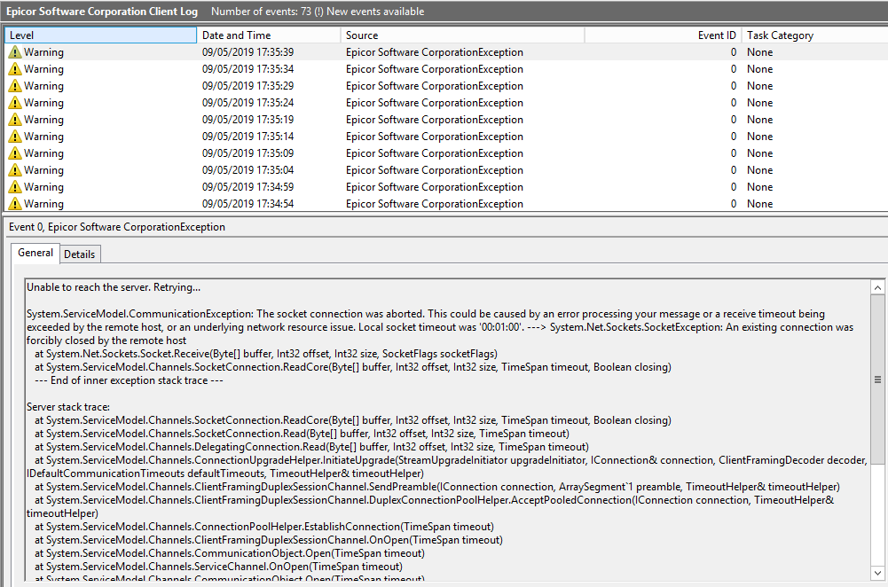 Install seemed to all go OK, no issues reported. The key menu item that it delivers is “Electronic Tax Reporting UK”. When trying to open this menu, the client flashes between the screen (which is now locked and unable to click anything), and a small dialog in the middle of the screen saying “Epicor is offline”: