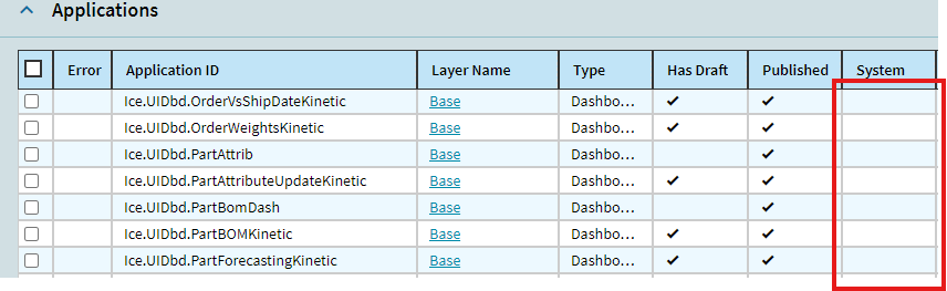Here’s a list of custom dashboards I’ve made– none are marked System (the associated Base layers for the “CHB_” layers in the first screenshot aren’t marked System as well, none of the layers I’ve made through App Studio are).