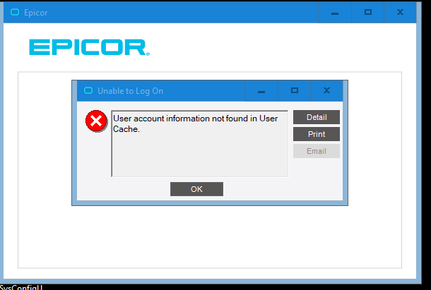 Even our third party vendor that set this all up does not know what is causing this epicor error. What seemed to work is making my domain login id MATCH the Epicor user id as a test. This could be a problem, as we would have to change all existing epicor user IDs that are linked to transactions and the like. But if that was truly the fix, then I don’t think I would be able to login at all successfully with my domain login id different than the epicor user id.