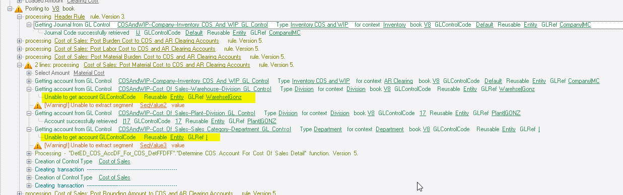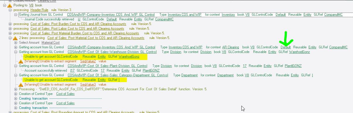 It then tries to substitute a warehouse GL for the division, and didn’t find one, but then it goes to the plant GL and there is one. Then it tries to get a department from the Sales Category, but there is none, so that fails. But that’s still OK. When all else fails, it can always use that first account.