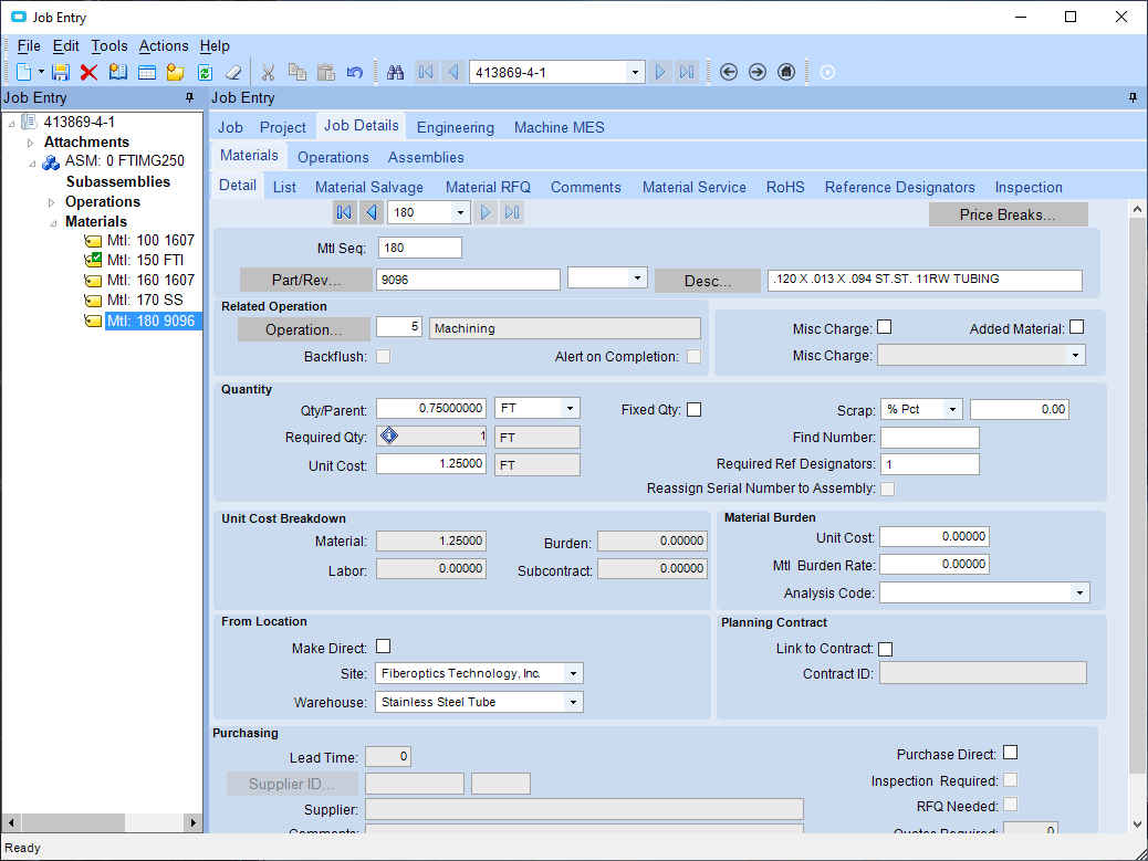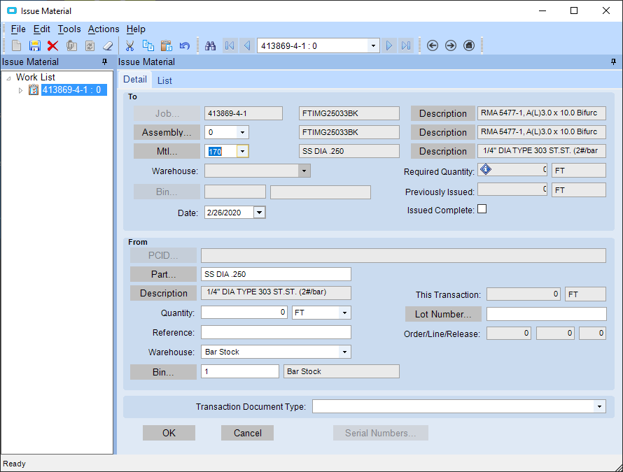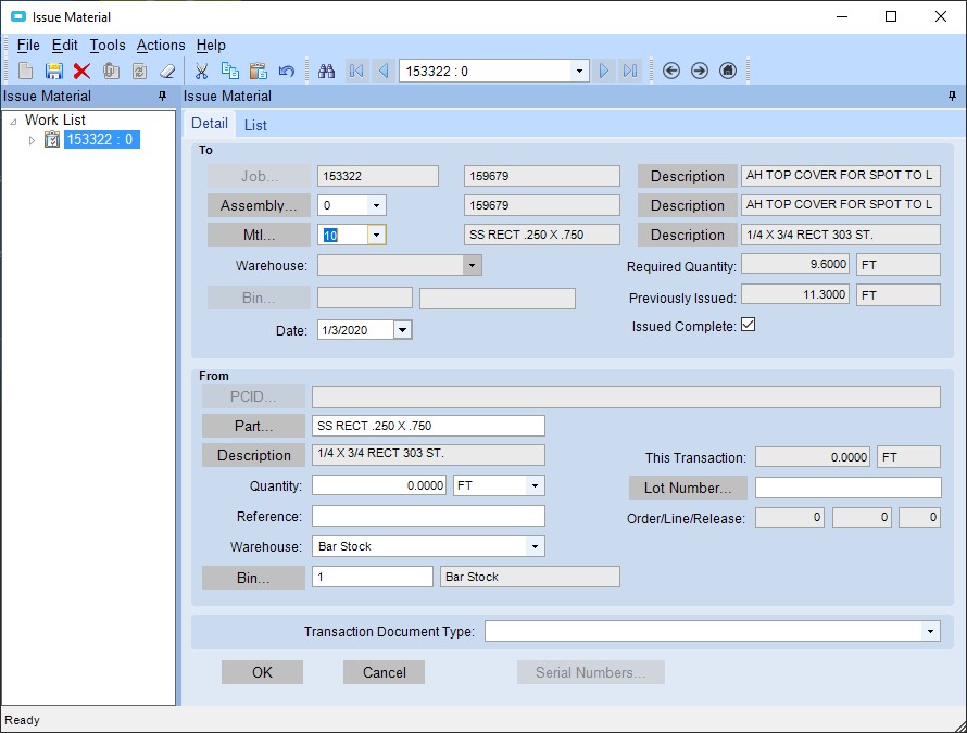 The job that this just happened on is inventoried in ft and the job has that material issued in feet so it’s requirement on the job is 0.25FT. When he initially tries to issue the material its only showing a whole number for FT and he can’t enter 0.25, it wont accept a decimal point. When he closes and reopens Epicor and goes back to Issue Material, its now showing the required amount as 0.2500FT and he can issue 0.25FT to the job. This is an interface issue only, nothing on the job is ever changed or edited to allow him to issue material, simply closing and relaunching Epicor corrects the view and allows him to issue a decimal qty.