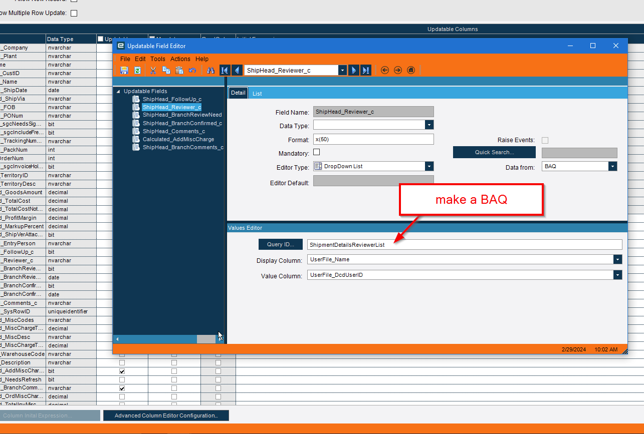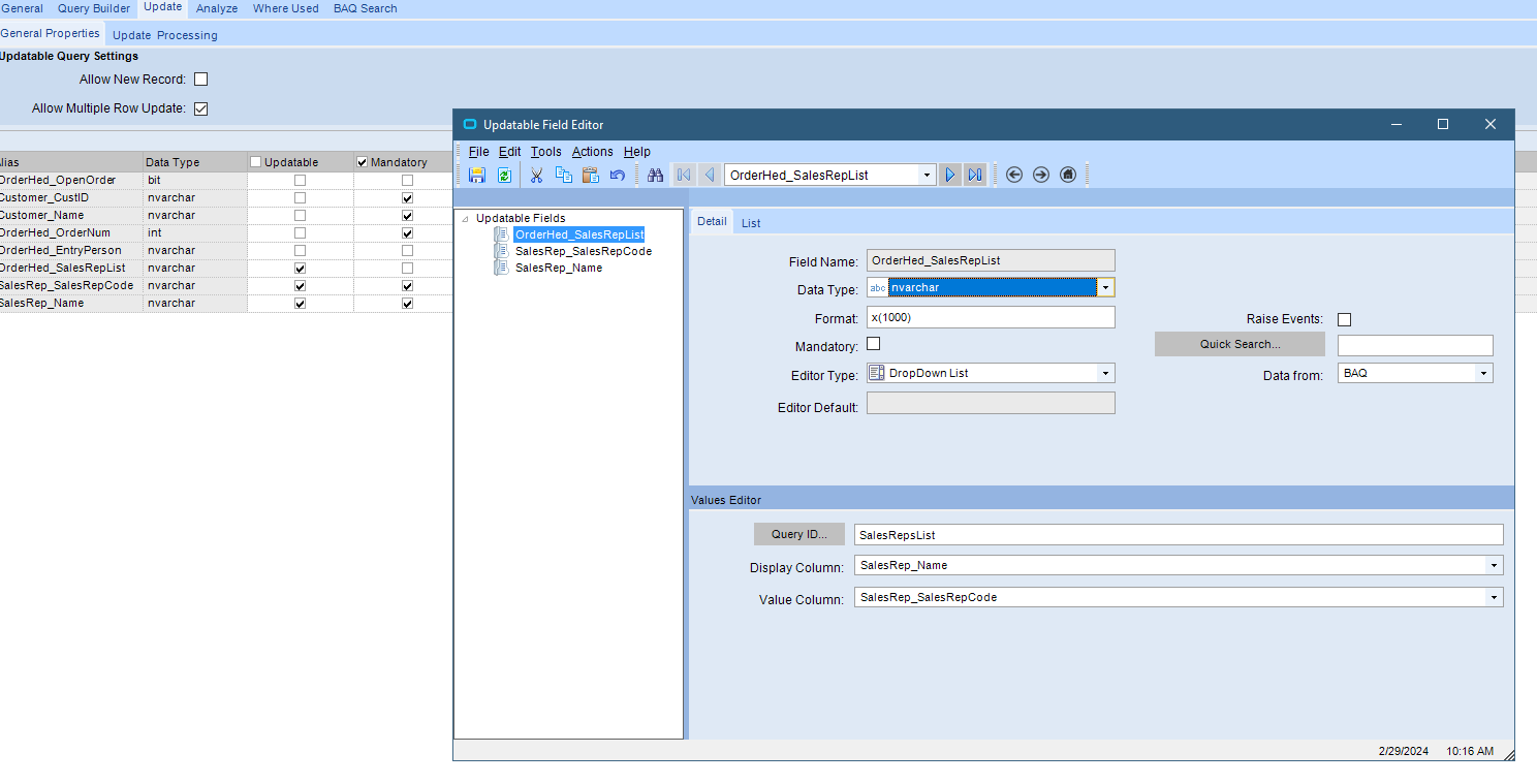 Because the OrderHed table stores SalesRepList as a concatenation of all SalesReps listed, and because it stores the SalesRepCode instead of the person’s name, I am having a hard time figuring out how to make that data updatable. It also seems like I don’t have access to the OrderHed.SalesRepCode1 field from a BAQ.