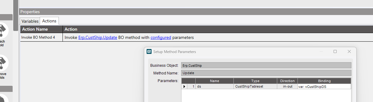 All I want to do is update ShipHead.Character02 with “Yes” when the user clicks "Shipped’ in Cust Ship Entry, Post-Proc BPM. I Use Invoke BO Method: