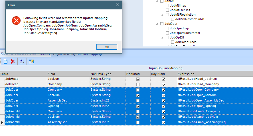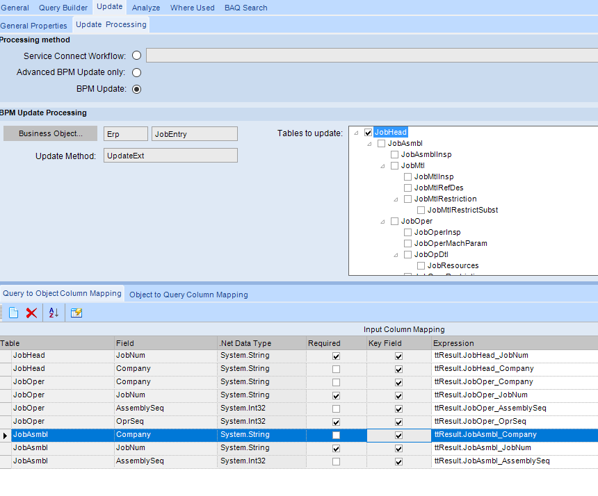 I’m creating my first updateable BAQ, so maybe doing something dumb… I only want three field to be updateable all in the JobHead table. I’ve chosen the JobEntry business object and in the tables to update I’ve unchecked all tables except JobHead. I get an error because I’m missing keys for a number of tables I don’t plan to update, so I attempted to delete those tables from the Query to Object Mapping section, but I can’t delete them all, JobOper and JobAssembl can’t be deleted(because they are mandatory key fields). When I try to save that leads to the error that I have Problems in BAQ update processing and it lists the keys for the tables I don’t plan to update in the JobOper and JobAsmbl table. Do I really need to display a bunch of keys that have no value as I don’t need to see them and don’t plan to update those tables? Again keep in mind this is my first updateable BAQ so more than likely I’m misunderstanding something or doing something dumb