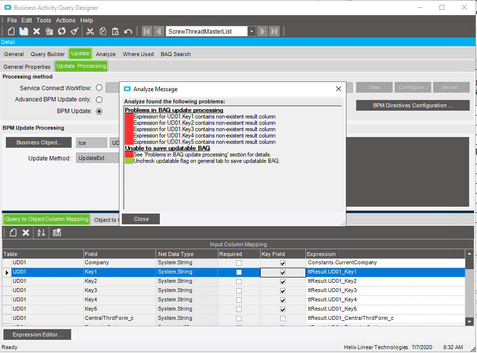 I have defined my UD columns for the UD01 Table, regenerated data model, and can create a BAQ on these fields. I am trying to make it an updateable BAQ but when I do that and try to save, I get errors about the UD01.Key1, UD01.Key2 … fields containing non-existent result column. I am not using those columns and when I go to Query to Object Column Mapping, I see that these columns are checked as key fields however it will not let me delete them or uncheck them as key fields. How do I get this error to go away?