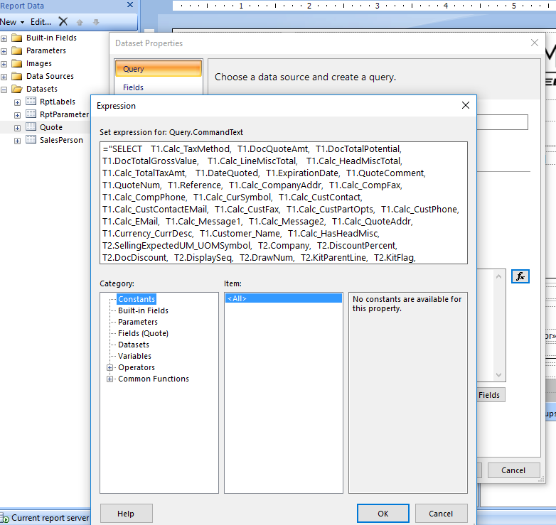 So I am extremely green with the SSRS reports…currently I have only modified existing reports, and even then required some help on one that was pulling form a BAQ. We have just made some changes to how we put information in the part attributes, and for the SSRS report used for our PO’s I need to include an extra field. Currently the report includes, or doesn’t include, certain fields based on the trantype (currently we only use PUR-MTL and PUR-SUB). Currently, when we are ordering material it only includes 1 of 3 fields, where as any Subcon activies it includes 3 fields. I need to add 1 more field when the trantype is PUR-MTL but I can’t seem to locate WHERE the report is being told to include the fields after it determines the trantype. I have some screen shots that will hopefully make my ramble somewhat more understandable…any help would be appreciated!