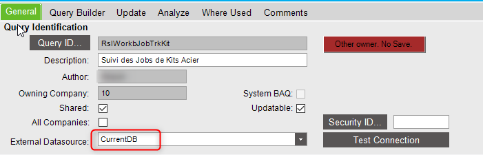 Still on the current production databse, create an external BAQ and configure the BAQ to be connected to the datasource “CurrentDB”