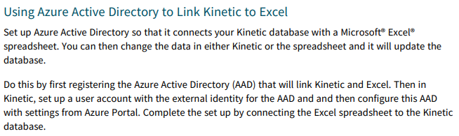 @tpogue brought it to my attention this morning about a feature in the 2023.2 What’s New guide - “Using Azure Active Directory to Link Kinetic to Excel”. It specifically mentions that " You can change the data in either Kinetic or the spreadsheet and it will update the database"