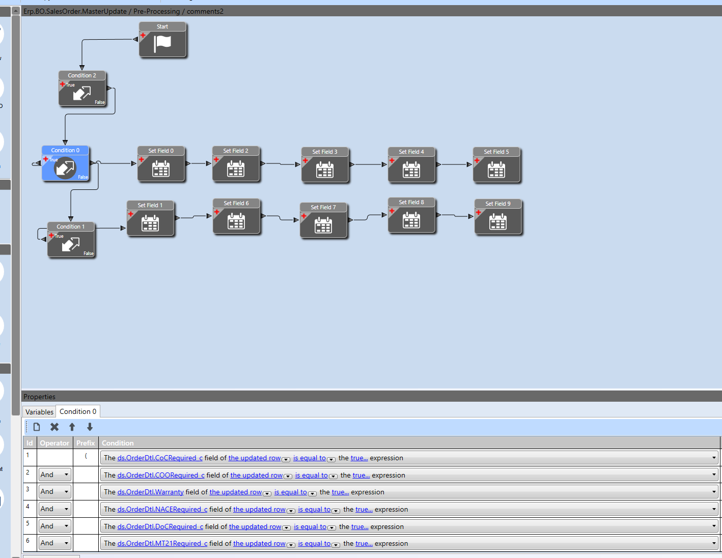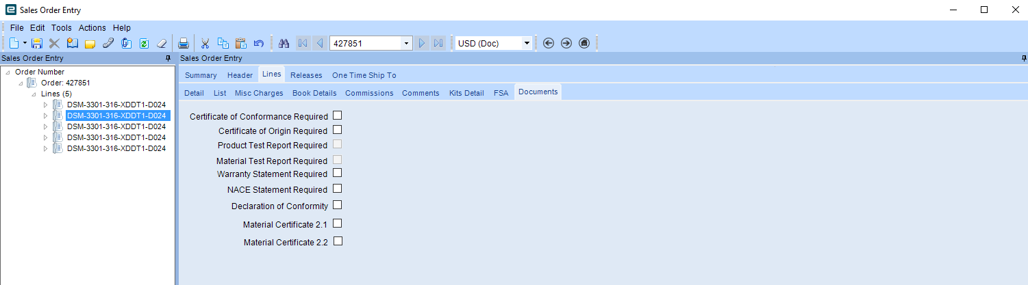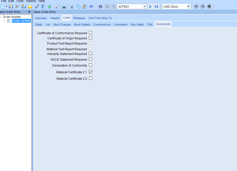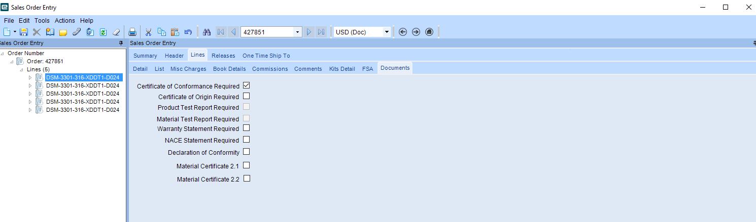 The goal here is to get Certificate of conformance box checked all the lines(specified criteria as company and current order), it should get checked on all lines. When I click on one line to enable it, it did gets enabled and cannot be turned off which is right but it doesn’t get translated to other lines.
