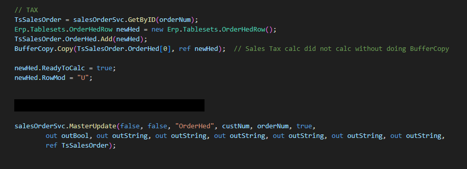 It’s probably the Before image / buffer copy situation. The below code works for me inside a Function that creates orders. Did not have to do the TaxConnectStatus / SetReadyToCalc steps.