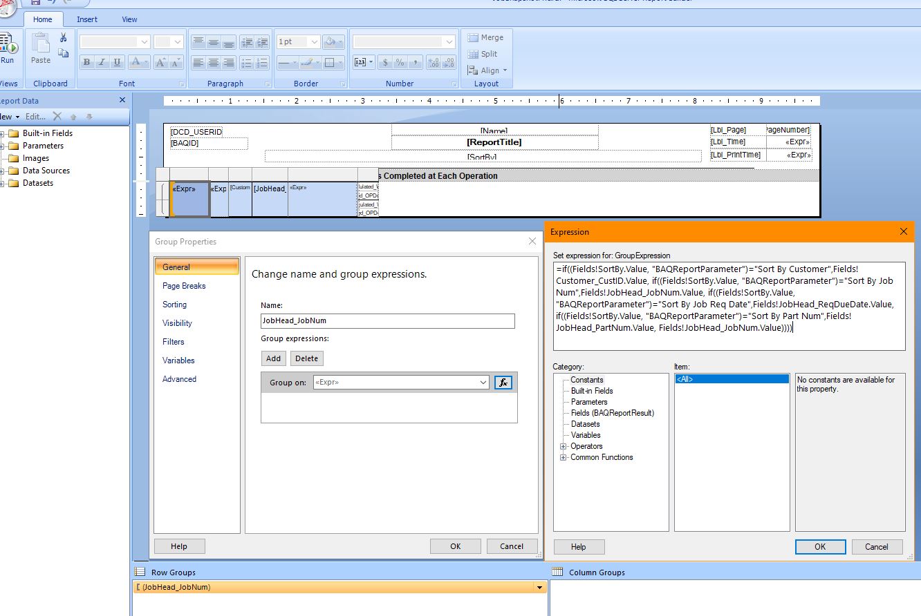The Group expression for the grouping ‘JobHead_JobNum’ refers to the field ‘SortBy’. Report item expressions can only refer to fields within the current dataset scope or, if inside an aggregate, the specified dataset scope. Letters in the names of fields must use the correct case.