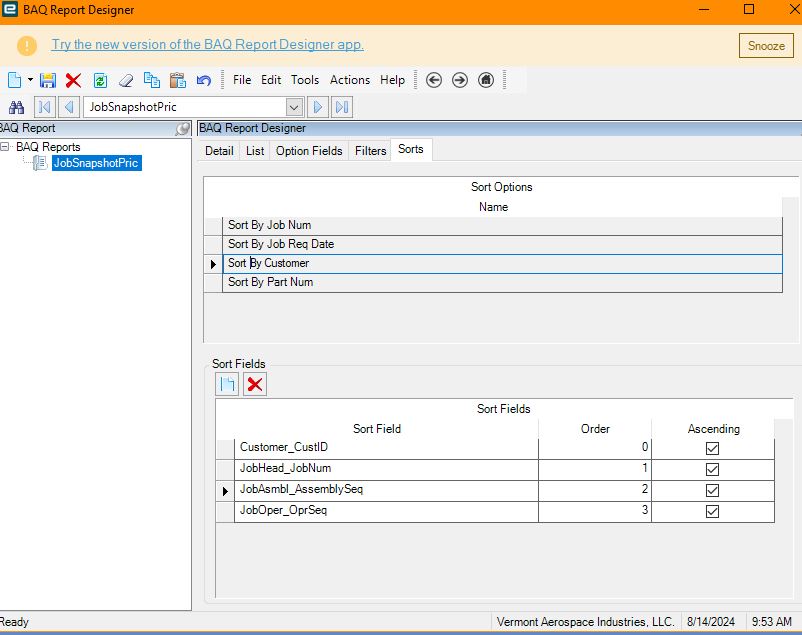 In my BAQ Report, there are 4 ways to sort, by Job, Part, Customer, or Date. I would like to reference these sorts when defining the group on expression. This is what I have tried in the group on expression: