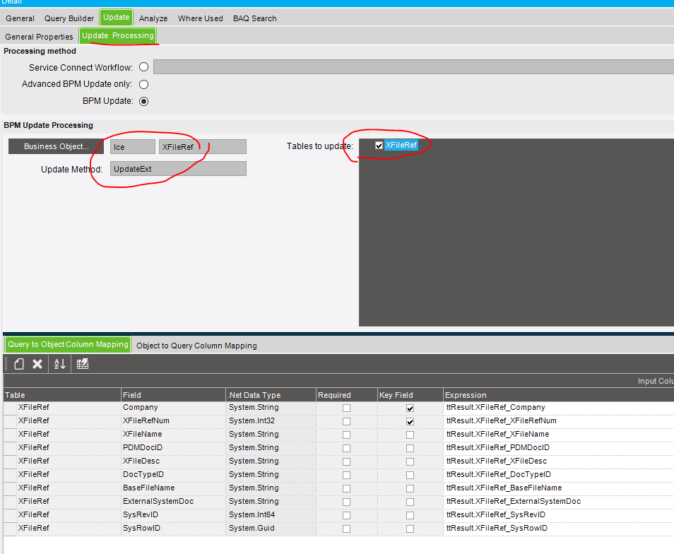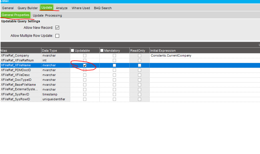 I want to update a field in XFileRef Table, and am unsure of how to do this. I think I have to use the menu Updatable BAQ Method Directives, then make the table updateable on the BAQ. I am only trying this with one document to test something.