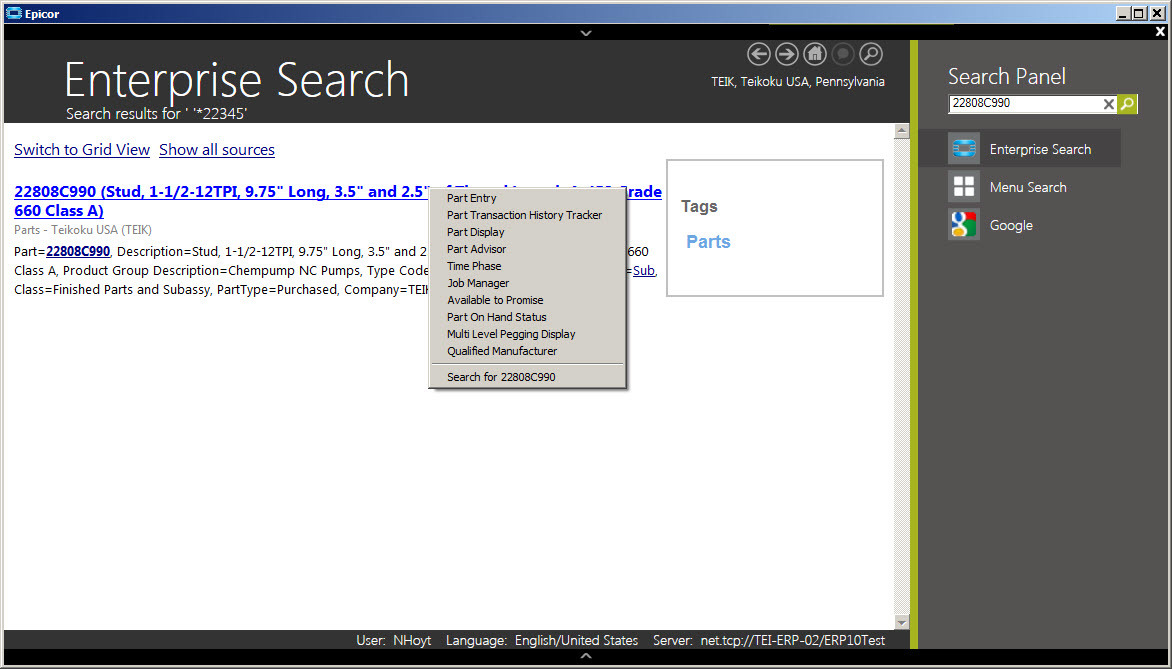 With regards to the context menu, Did you right mouse on the actual part number link or the heading link? You need to configure like fields in the BAQs for Enterprise search