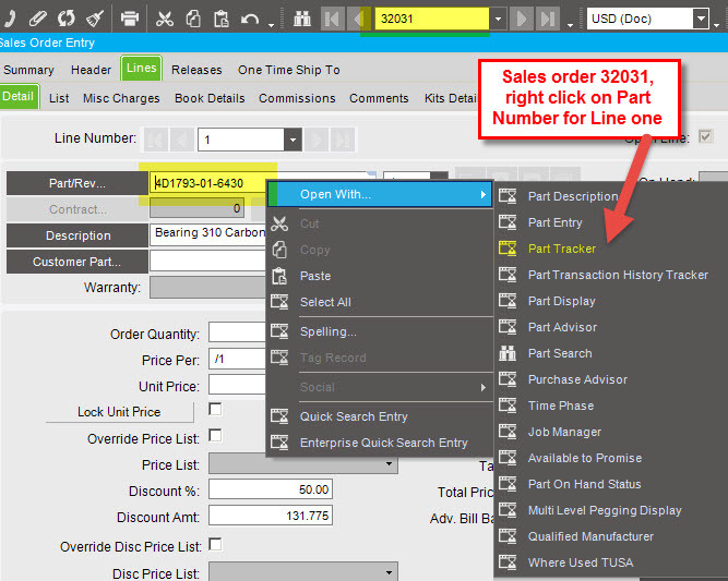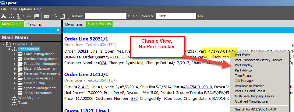As far as the context menu, I still have a problem. Please see screenshots. I have Part tracker available on Part field in sales order (picture 1), but then when I use enterprise search and right click from found data for the sales order line (picture 2) I don’t get Part tracker. Therefore, system doesn’t seem to use the same context menu items for Part Field on a sales order. Any thoughts on why? Most people don’t have part entry privileges, so of course the tracker being here on the enterprise search with the open with is important.