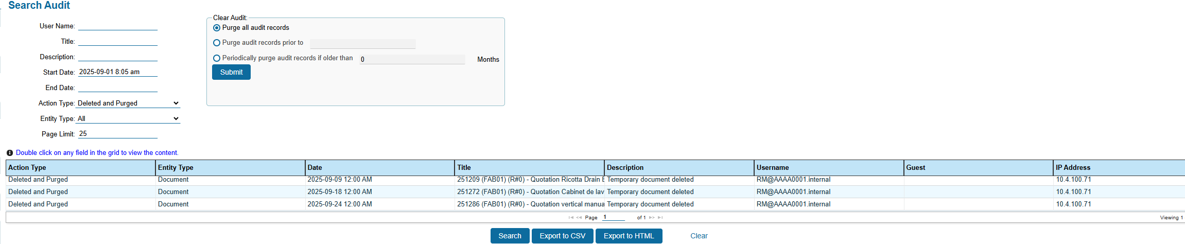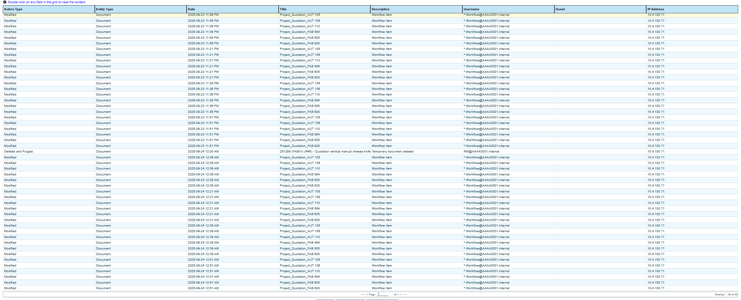 - Audit Trail: Not much, we see that there is some documents being modified (Seems like old documents because the title is not standard for our process) but apart from that, I don’t see anything that I can work with: