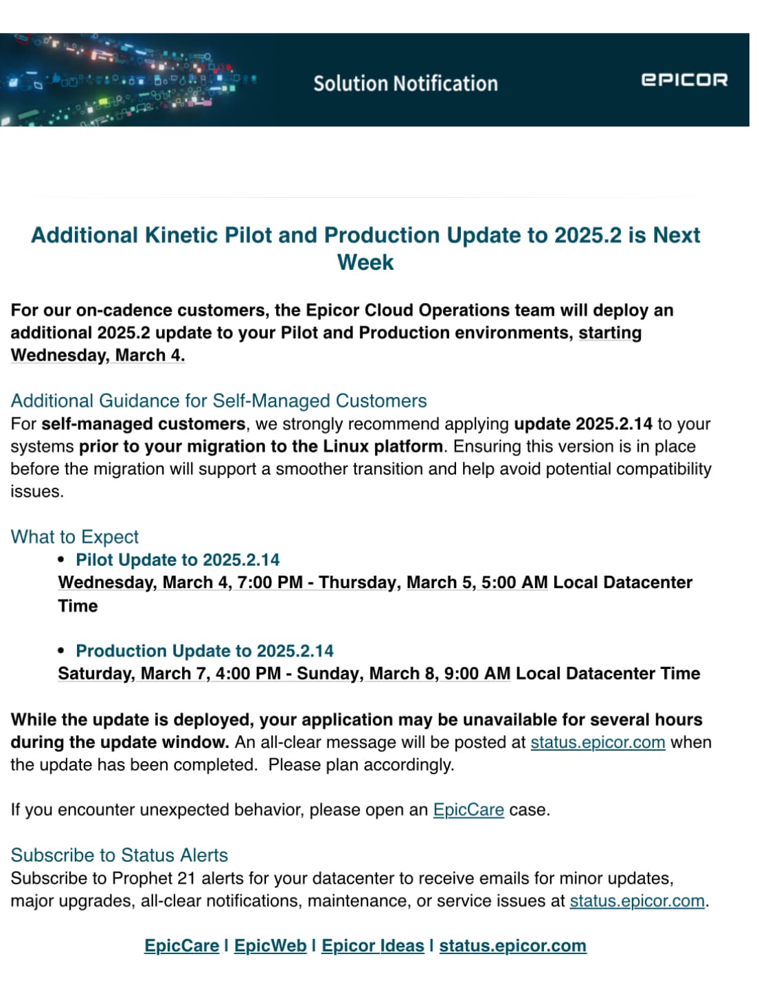 We communicated the 2025.2.14 production upgrade before Pilot was available. Thatās backwards. I completely understand why that raised eyebrows, especially for those of you who want to validate changes in Pilot before anything touches Production.