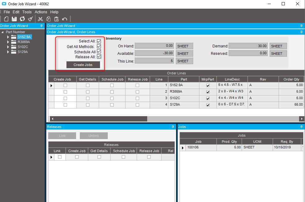 Its because your parts are MRP planned (that’s what the MRP checkbox is showing you) that you have to do each line individually. Essentially what its saying is normally these parts are MRP planned so by using order job wizard you are overriding that functionality which is why you have to create a job for each line manually. If these were not MRP Planned parts then you could use the select all functionality instead of each individual line