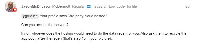 If not, whoever does the hosting would need to do the data regen for you. Also ask them to recycle the app pool, after the regen (that’s step 15 in your picture).