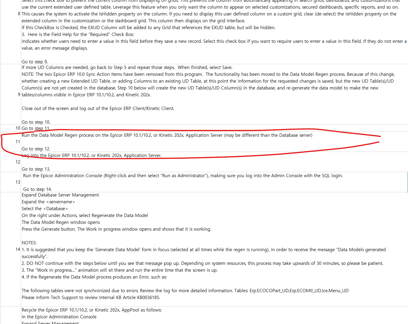 But as you can see in the steps below, I got stuck at step 11. I created a new column in UD Column Maintenance, but I don’t know where the Data Model Regen process is.