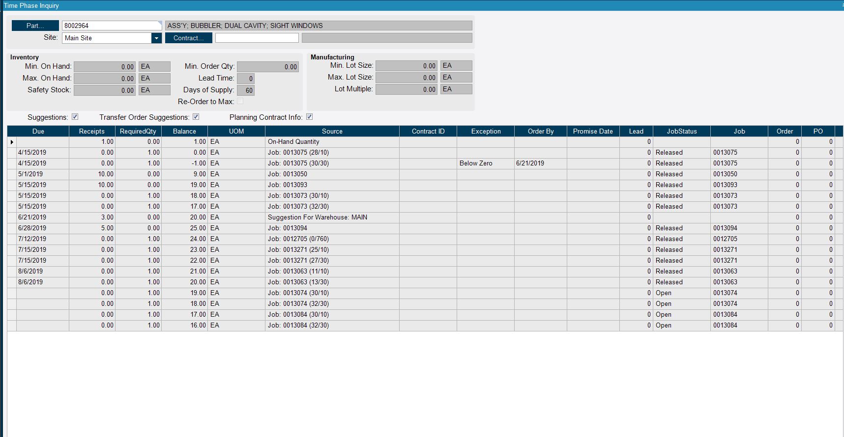 There is a "special’ table called PartDtl… you can see it in BAQs. This table shows all “Supplies” and “Demands” for a part. it is what MRP uses to decide what new suggestions to make. It is the table that is viewed when looking at the Time Phase screen/report. Lots of cool data is “hidden” in this table.