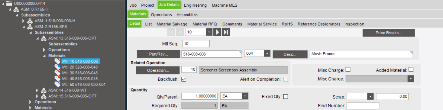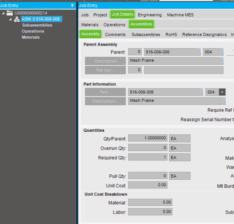 516-008-006 is manufactured. We use pull & view as assembly to ensure only 1 job is created for a sales order. There are 32 similar jobs in the system we’re looking at with the BOMs being built the same way but just this one part wants to generate it’s own jobs. Checked min on hand and all zero.
