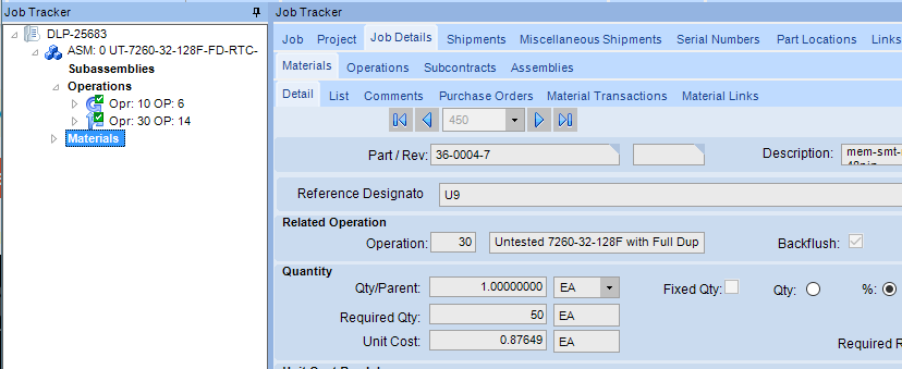 @timshuwy Job Closing caught an issue where we under issued a material. In reviewing the job we found the part was configured to backflush at operation 30 which was completed, but the part was not issued(see screenshots below). It looks like we have plenty of this part in stock, so we are a bit stumped as to why it didn’t backflush. I looked in Part Transaction history for any transactions related to the job and there were none.