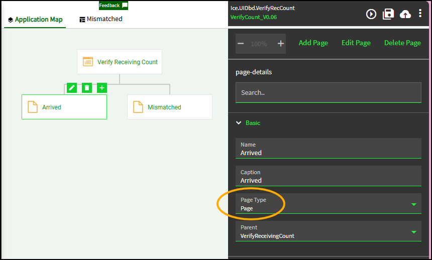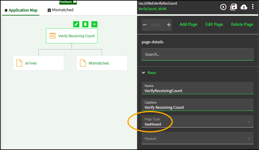 - The parent page (“Verify Receiving Count”) is the page they give you when you make a new app. You can see the “Page Type” is “Dashboard” and is not editable.
