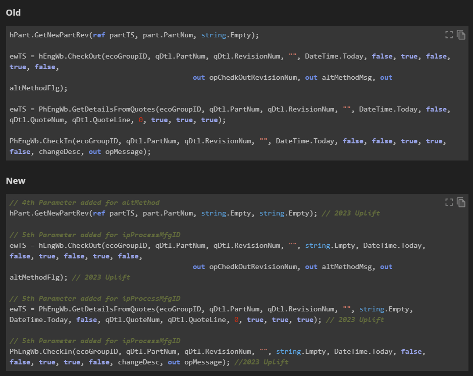 Here are some examples. Epicor added parameters to these calls. When I’ve had these method calls in widgets, the widget breaks, and doesn’t allow you to simply add the missing parameter. You have to create a brand new widget to get the added parameter calls. With the custom code, we just simply add a , and the parameter. Fixed.