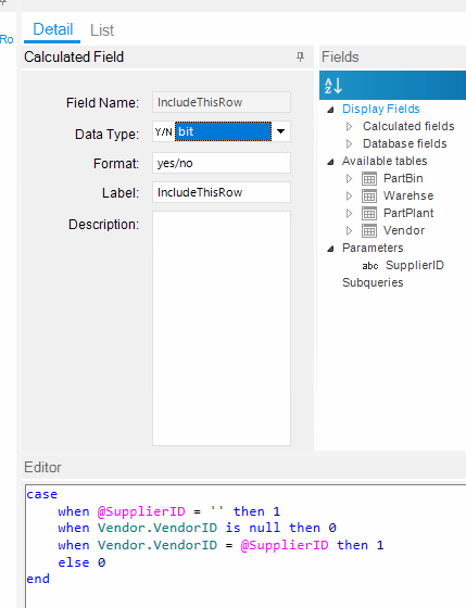 I have been asked to build a report that is filterable for VendorID, but if the filter isn’t specified, shows all part numbers from Part Bin even if there isn’t a VendorID for that part.